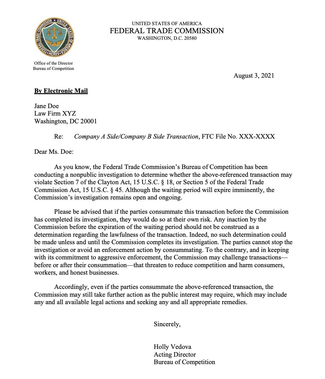 Replacing that process with “warning letters” for all merging parties, warning them that the government could bring a legal challenge to the deal at any time, and that the merging parties would close the deal at their own risk.