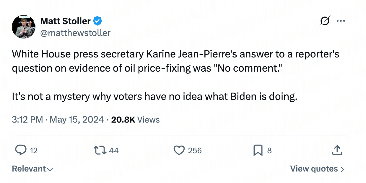 On an anti-trust case, he took issue with press secretary Karine Jean-Pierre not articulating a price-fixing critique.